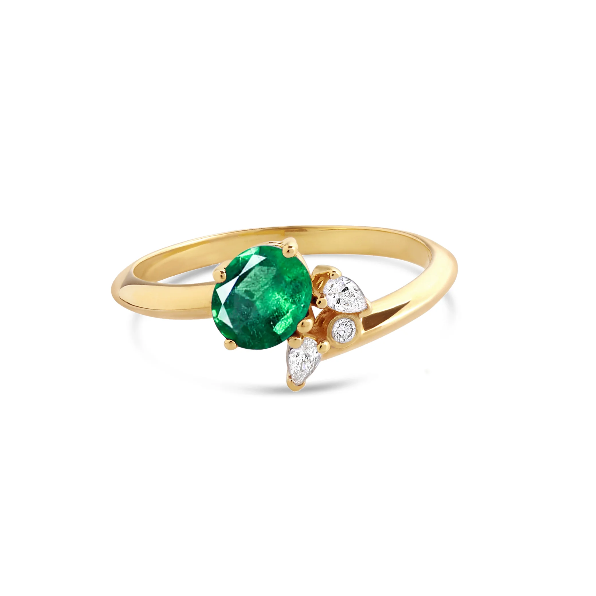 At its heart is a 0.90 carat emerald, beautifully flanked by two pear-shaped diamonds and one round diamond, totaling 0.14 carat.