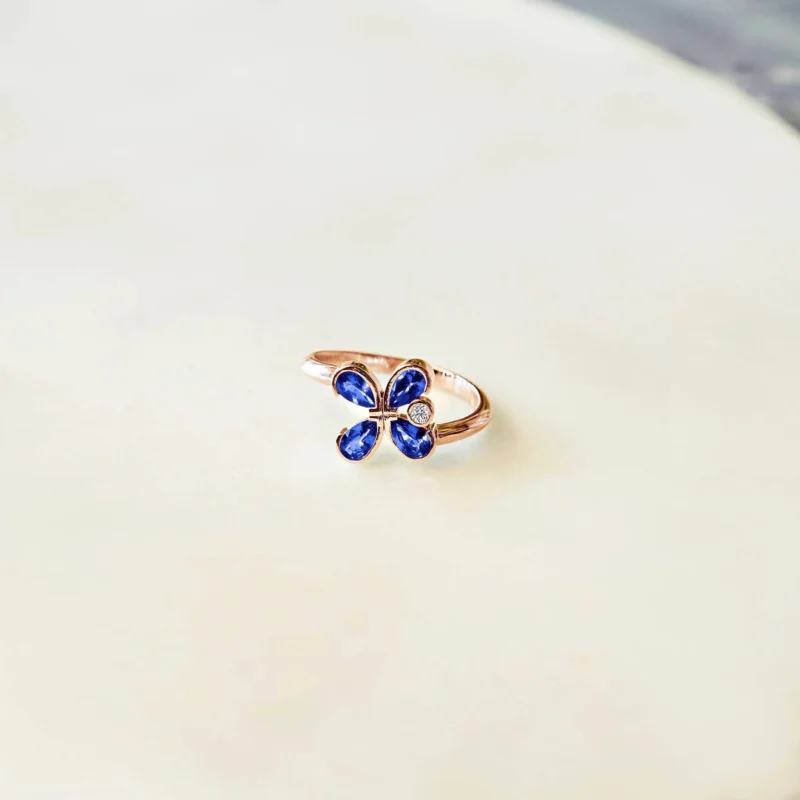 The Milestone blue sapphire and diamond ring in 18K gold blooms with the grace of fully opened petals.