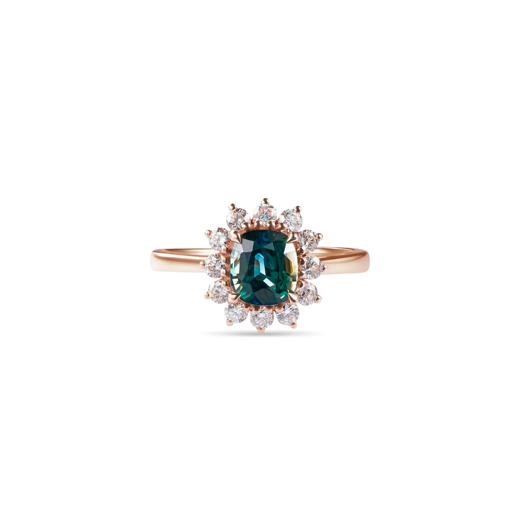 At the center, a 1.20-carat teal sapphire radiates an enchanting hue — shifting with the light, between the sparkle of a lagoon and the depth of a mountain forest. Twelve GVS diamonds form a delicate crown around it, totaling 0.30 carat. The entire piece rests on an 18K rose gold band, chosen for its subtle warmth and soft tone on the skin. The Hera ring doesn’t demand attention — it suggests. And that’s what makes it unforgettable.