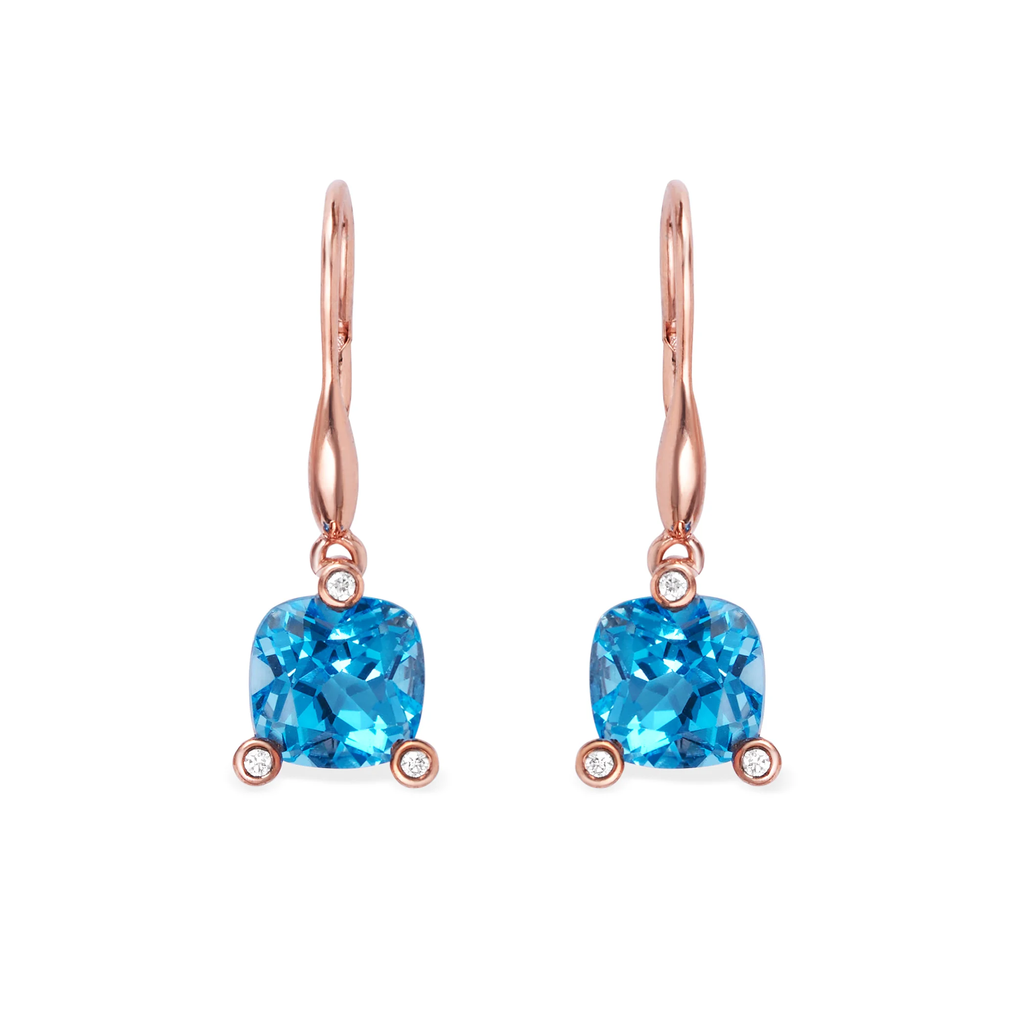 Each earring features a 3-carat topaz, totaling 6 carats, set with G-color, VS-clarity diamonds on 18K rose gold.