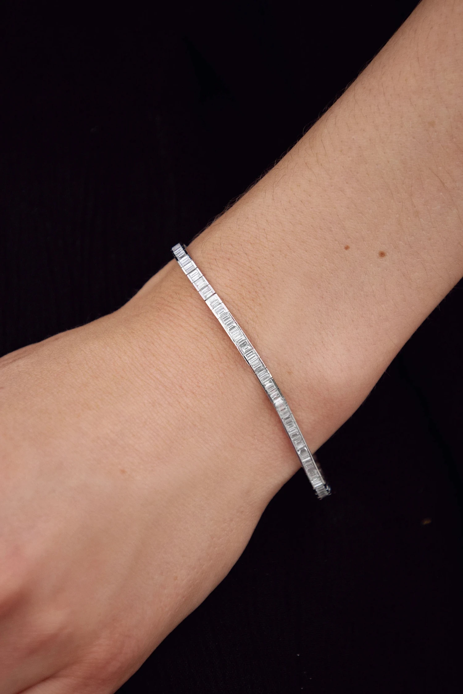 Sandrine was looking for a piece that would reflect both her quiet strength and understated elegance. She found it in this diamond river bracelet — a seamless flow of light and clarity, where each baguette diamond captures a precious moment, perfectly aligned to shine with serene intensity.