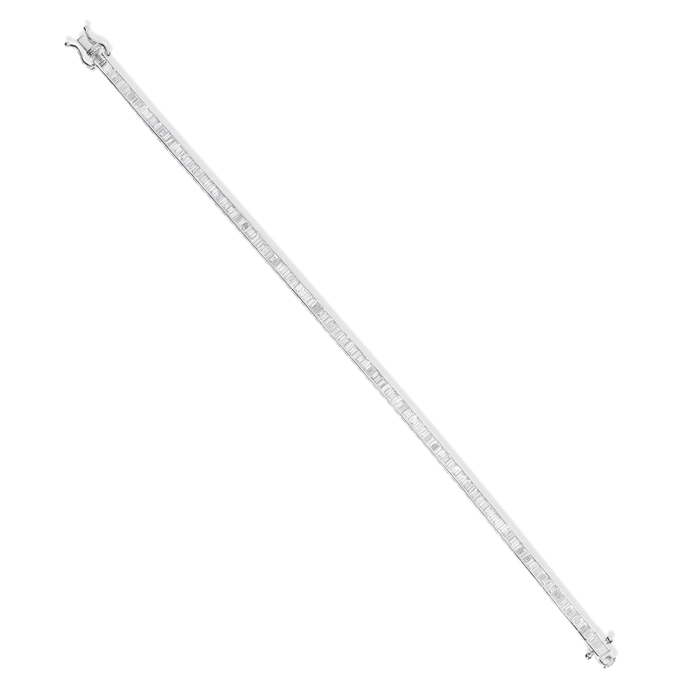 Crafted in 18K white gold, this 18 cm bracelet features 3 carats of meticulously cut baguette diamonds. Their sharp angles and GVS quality create a structured brilliance that radiates harmony. Each stone is precisely set to form a continuous stream of sparkle — a piece that embodies timeless sophistication.