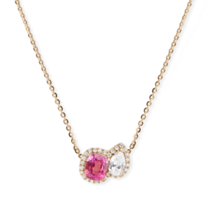 The necklace features a 0.70-carat pink sapphire, glowing with gentle warmth, paired with a 0.12-carat round diamond of G color and VS clarity. Both gems are delicately set on a fine 18K gold chain (available in rose, yellow, or white gold). The result is an elegant, minimalist piece infused with powerful symbolism.